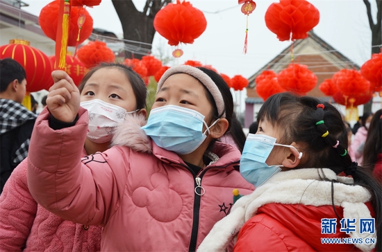 2月15日,河南省平顶山市宝丰县闹店镇贾寨村文化广场,小朋友们在猜灯谜。新华网发(何五昌 郭培娟 摄)