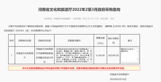 2月16日,河南省文化和旅游厅发布在河南省政府采购网上的采购项目名称一栏显示为:河南博物院新院全球概念性设计项目。该项目选址拟在郑东新区白沙组团象湖以东地块,通惠路以西、前程大道以东、荣昌路以北、升平路以南围合的170亩区域内,规划建筑面积为20万㎡,其中主体建筑面积14.8万㎡,地下辅助建筑面积5.2万㎡,主要包括公众区域、业务区域、行政区域。