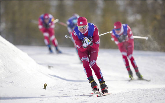 2月19日,冠军俄罗斯奥委会选手亚历山大·博利舒诺夫(前)在北京冬奥会越野滑雪男子50公里集体出发(自由技术)比赛中。新华社记者牟宇摄