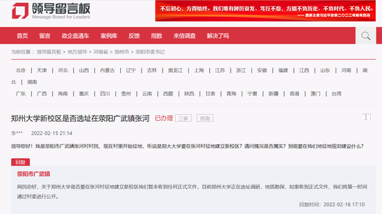荥阳当地官方回复称,关于郑州大学是否要在张河村征地建立新校区,暂未收到任何正式文件。目前郑州大学正在选址调研,地质勘探,如果收到正式文件,将第一时间通过村委进行公开。