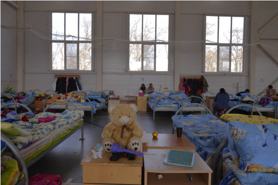 2月22日,在俄罗斯罗斯托夫州,玩具熊被摆放在一处为乌克兰东部难民设置的临时安置点内。新华社发(安德烈摄)