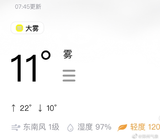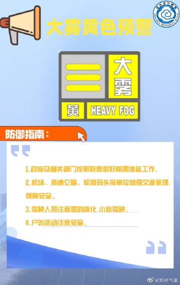 郑州市气象台2022年03月12日22时40分发布大雾黄色预警信号:预计今天夜里到明天上午,郑州市区、航空港区将出现能见度小于500米的雾,局地能见度小于200米。请注意防范。
