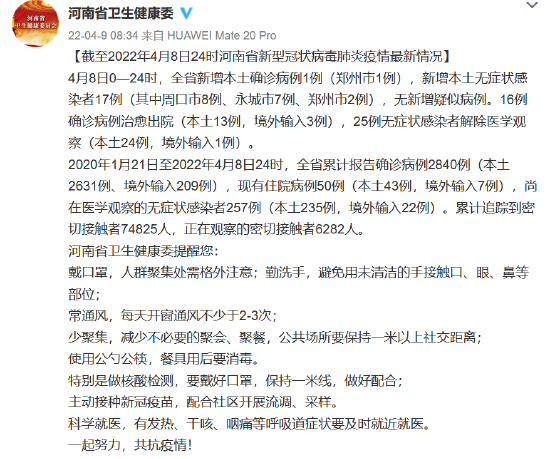 4月8日0—24时,全省新增本土确诊病例1例(郑州市1例),新增本土无症状感染者17例(其中周口市8例、永城市7例、郑州市2例),无新增疑似病例。16例确诊病例治愈出院(本土13例,境外输入3例),25例无症状感染者解除医学观察(本土24例,境外输入1例)。