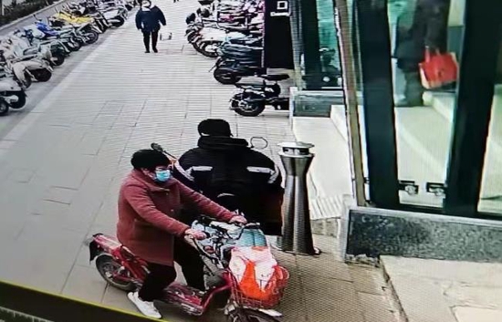 淮河路派出所民警吕品、聂昌龙接警后,立即赶到现场,向山先生和刘大爷详细询问了事情经过,并立即调取事发现场附近的监控,发现冒领女子体态偏胖,短发,戴蓝色口罩,骑一辆红色电动自行车。
