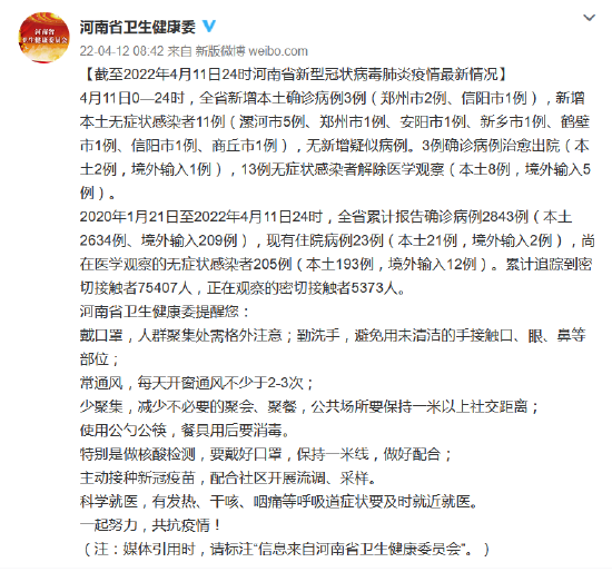 [截至2022年4月11日24时河南省新型冠状病毒肺炎疫情最新情况]