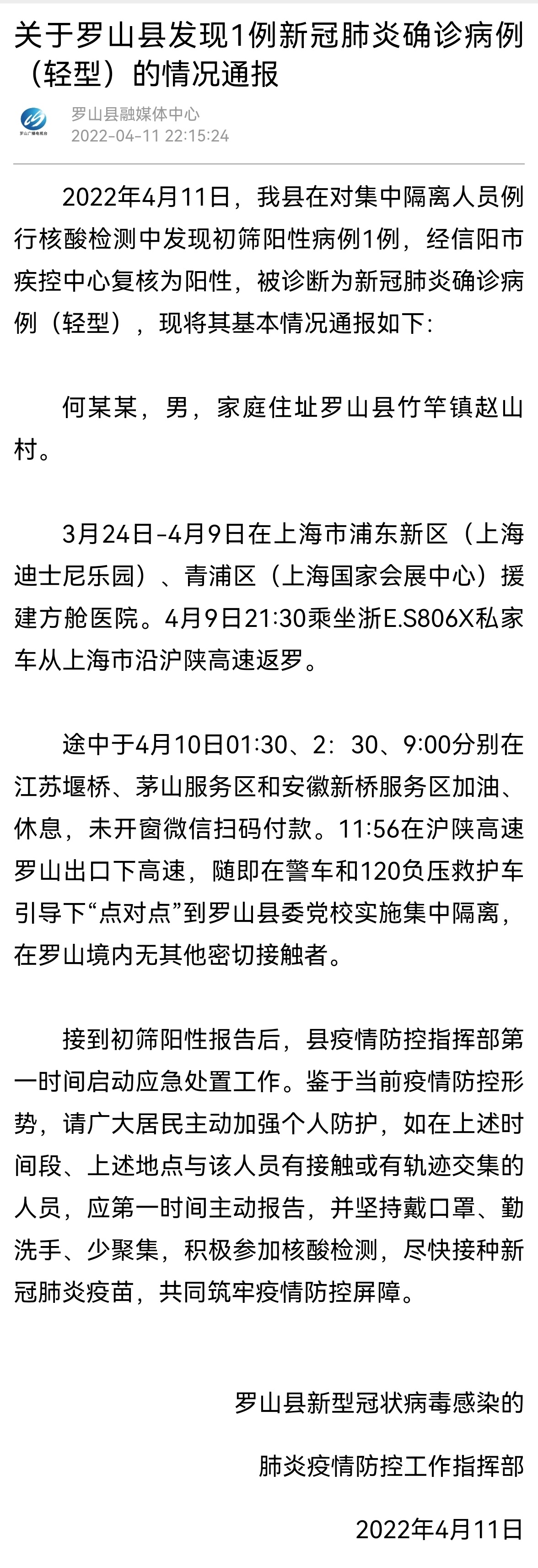 【罗山县发现1例新冠肺炎确诊病例(轻型),系援建方舱医院人员】2022年4月11日,我县在对集中隔离人员例行核酸检测中发现初筛阳性病例1例,经信阳市疾控中心复核为阳性,被诊断为新冠肺炎确诊病例(轻型),现将其基本情况通报如下: