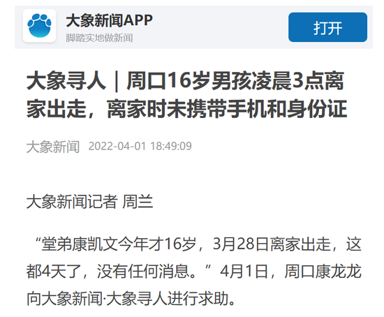 4月1日,记者发布《大象寻人|周口16岁男孩凌晨3点离家出走,离家时未携带手机和身份证》稿件后,有位网友评论称“向南走?不就是河吗”。
