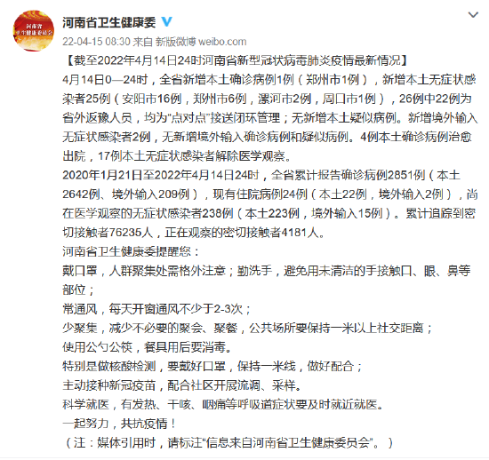 [截至2022年4月14日24时河南省新型冠状病毒肺炎疫情最新情况]