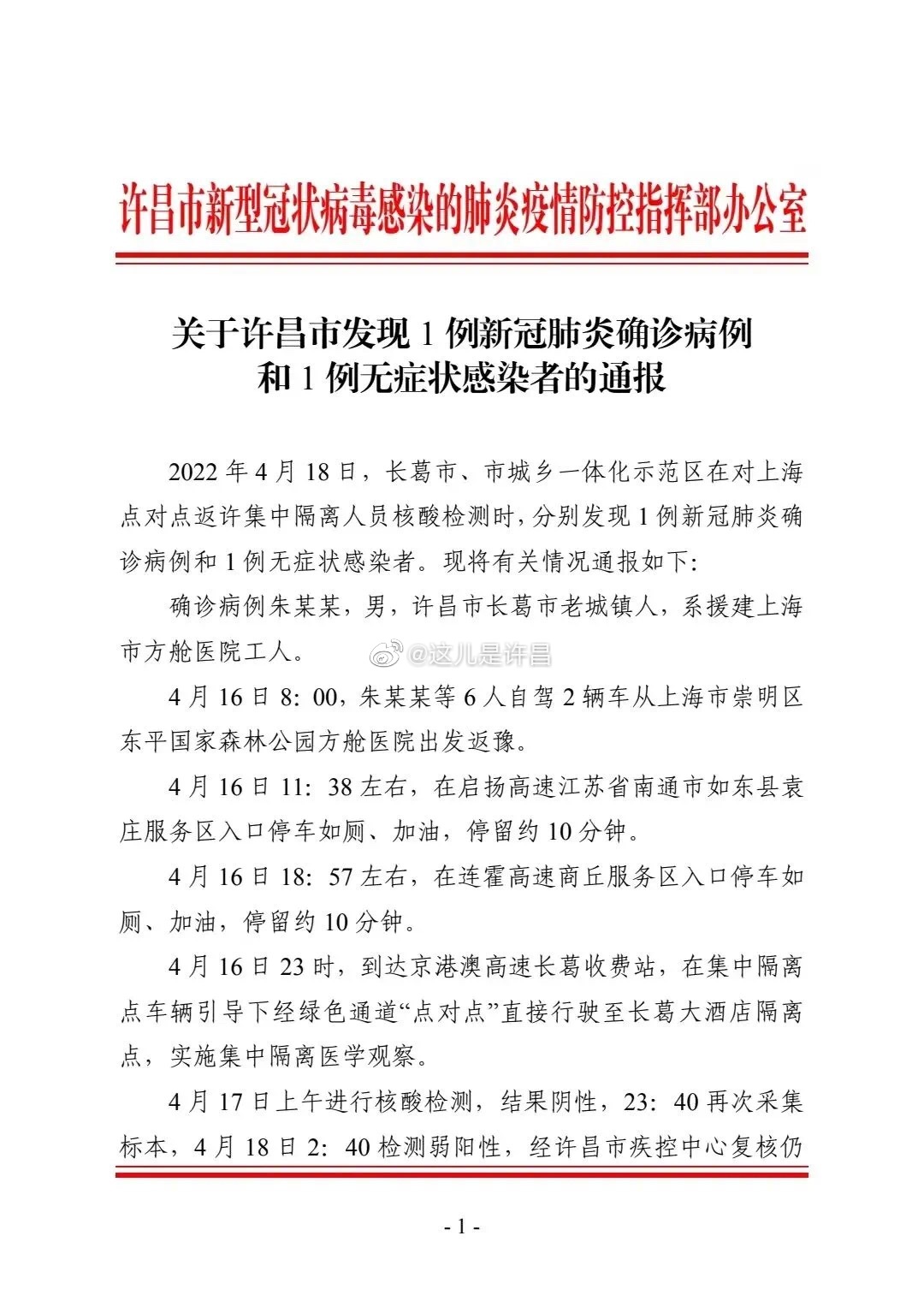 2022年4月18日,长葛市、市城乡一体化示范区在对上海点对点返许集中隔离人员核酸检测时,分别发现1例新冠肺炎确诊病例和1例无症状感染者。现将有关情况通报如下: